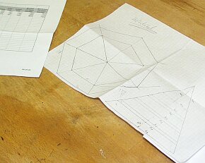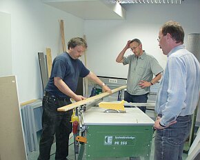 | Nun stand der wichtigste Bauabschnitt bevor. Der erste Kreis wird zugeschnitten. Noch einmal die Berechnung überprüft, den Winkel auf der Maschine penibel eingestellt, das Brett angeschnitten ..... den Kreis zusammengelegt .... und ...... wie jetzt ??? Da klafft doch eine Lücke ??? |