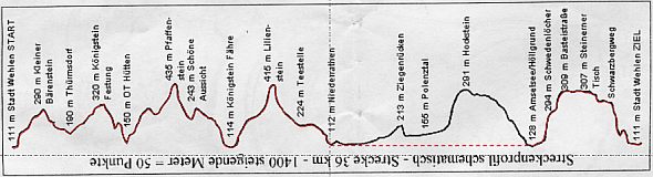 | 27. März 2004, 7:08 Uhr,S-Bahnhof Stadt Wehlen, los geht es zum Bergtest. Hier das Streckenprofil. (Rot gekennzeichnet unsere 28km-Strecke. Die volle 36km-Tour geht zusätzlich über den Hockstein.) - Zur Streckenkarte - |