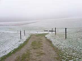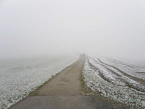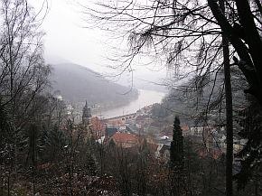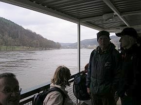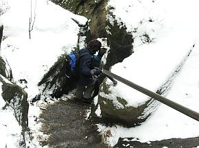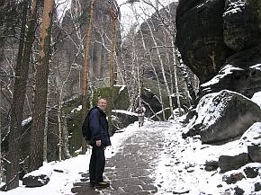 | Vom Pfaffenstein wieder hinunter durch das vereiste Nadelöhr. | Im Hintergrund, links, schon das nächste Ziel im Blick, der Lilienstein. Doch erst ging es hinunter zur Elbe und mit der Fähre auf die andere Seite. |