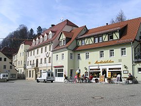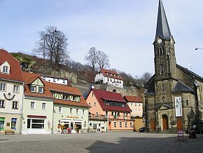 dem Bahnhof, verbunden nur über die Fähre. Urkundlich wurde Wehlen erstmals in der ersten Hälfte des 13. Jahrhunderts als "Städtlein" oder "Wehlstädtl" erwähnt. Im Schutze einer einst mächtigen Burg, die im Jahre 1269 entstand, siedelten sich Fischer, Steinbrecher und Schiffer an. Im Mittelalter verfiel die Burg wieder, von der heute außer dem Burgberg und einigen Gewölberesten leider kaum noch etwas zu sehen ist. Vom Burgberg, der von der Stadt aus über Treppen zu erreichen ist, hat man einen wunderbaren Überblick über den Ortskern mit dem Marktplatz bis hinüber nach Pötzscha: |