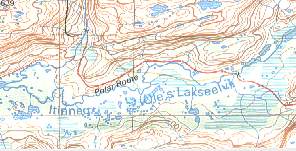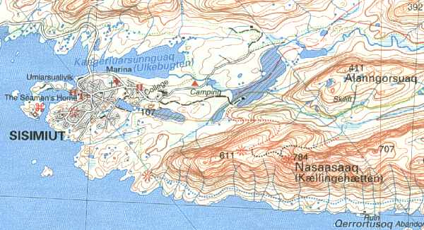 | Die folgende Karte zeigt einen Ausschnitt aus der zur Verfügung stehenden Wanderkarte. Es ist der Stadtplan von Sissimiut und das erste Stück der Wanderroute zu sehen. Die Farbe Grün ist nicht vorhanden da es auf Grönland keine Bäume gibt. Die Wanderroute ist alle 2 bis 3km mit einem Steinhaufen markiert. Den Weg muss man sich selber suchen. Ein guter Kompass und ein Fernglas zum Suchen des nächsten Steinhaufens leisten hier gute Dienste. |