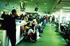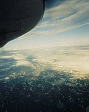 Links: Schalterhalle, Rechts: Auf dem Flug nach Nuuk. Zu sehen sind die vielen, noch mit Eis bedeckten Seen. |