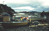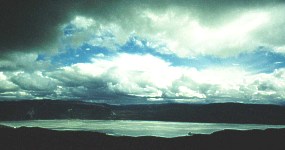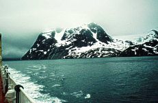 | Auf fast der gesamten Schiffspassage (Gesamtzeit 24 Stunden) zeigte sich das grönländische Wetter nicht von seiner besten Seite. Starker Wind, Regen und dicker Nebel. Von den herrlichen Fjorden, die wir durchquerten, kann man nur etwas erahnen. 3 Stunden vor Sissimiut drehte der Wind landeinwärts und es war plötzlich blauer Himmel. Nun war der Blick frei zur Küstenlinie. | ![]() |