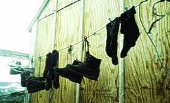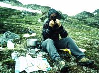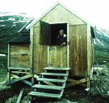 | Die Weiten Grönlands lagen vor uns. Auf die häufigen Bach- und Flussdurchquerungen und die Millionen von Mücken waren wir gut vorbereitet. Doch das Essen mit Moskitonetz berei- tete noch einige Schwierigkeiten. Mittlerweile gibt es auch drei Schützhütten, die zwar recht klein sind, in denen es sich aber gut hausen lässt. Gegen die Mücken (eine Tierart der sehr wenigen auf Grönland) kann man sich in den Hütten besser wehren. |