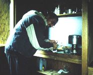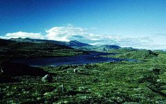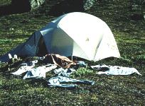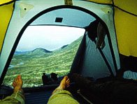 Im Sommer ist es nördlich vom Polarkreis auch in der Nacht taghell. (Die Sonne steht nur wenig unterhalb des Horizontes.) Wegen der Mücken konnten wir die herrlichen Landschaftsausblicke nur vom Zelt aus betrachten. Unser Fernsehen am Abend. | ![]() |