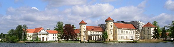 | Zuerst entstand im 12. Jahrhundert eine Burg als Grenzbefestigung gegen Mecklenburg. Nach einem verheerenden Brand (1566) baute Achim von Bredow dort ein kleines Schlösschen. 1734 kaufte es der preußischen König Friedrich Wilhelm I. für seinen Sohn und Kronprinzen Friedrich. Durch einen großen Umbau unter den Baumeistern Kemmeter und Knobelsdorff kamen ein Mittel- und ein Nordflügel hinzu sowie ein zweiter Turm und auf der Seeseite die Kolonnade. Friedrich und seine Frau wohnten im Südflügel bis 1740. Dann musste der Kronprinz nach Berlin übersiedeln, um die Thronfolge anzutreten. Bis 1744 wurde die Schloß- und Parkanlage weitestgehend vollendet. Nachdem Friedrich II. seine Regentschaft antrat, schenkte er das Anwesen seinem Bruder Prinz Heinrich (1726 - 1802), der bis zu seinem Tode das Schloß bewohnte und die gesamte Anlage umfangreich erweitern und teilweise neu gestalten ließ. Mit Theodor Fontane und Kurt Tucholsky bekam der Ort auch einen namhaften literarischen Ruf. |