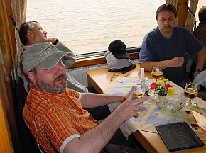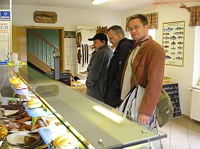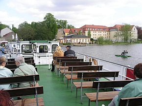 | Den Rückweg wollten wir sehr gemütlich mit dem Dampfer zurücklegen. Die Zeit bis zur Abfahrt verkürzten wir durch Essen von geräuchertem Seibling, Butterfisch und echtem Rheinsberger Kronprinzen - Bier |