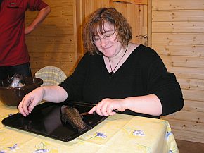 | Auch heute musste noch etwas zum Essen auf den Tisch. Schön geräucherte Lachsforelle, frisches Brot, Butter, Rotwein ...... wenn es das nicht gibt ..... seid kreativ. An dem nahe gelegenen See mit der Werbung "Lachsforellen" mussten diese selbst geangelt werden. Also gab es frische Forellen. Im "Konsum" wurden noch Kartoffeln, Butter und Lauch eingekauft. Die Forellen waren kaum im Ofen spendierten uns unsere Vermieter eine leckere Eiersuppe und Schweinebraten mit Backpflaumen. | |