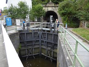| An den 195 Meter langen Tunnel ist an der Südseite eine zwischen 1844 und 1847 erbaute Koppelschleuse angeschlossen, die von Hand bedient werden muss. Diese gleicht den Höhenunterschied von 4,65 Metern aus. Jede der beiden Schleusenkammern hat eine Länge von 42 Metern, wobei sich ein Teil der Schleusenanlage innerhalb des Tunnels befindet. Die Wassertiefe im Tunnel beträgt 1,75 Meter, die Tunnelbreite liegt bei 5,6 Metern, die Tunnelhöhe liegt am Scheitelpunkt der Röhre bei 6,3 Metern. (Quelle: https://de.wikipedia.org/wiki/Weilburger_Schifffahrtstunnel) | |
