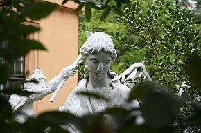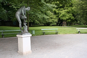 | 1940 von Bernhard Bleeker; Bronzefigur auf Steinsockel; Speer verloren gegangen. Aufstellung im Lietzenseepark in der Nachkriegszeit. | Bronzeskulptur auf Steinsockel von Fritz Röll. Aufstellung im Lietzenseepark 1962. |
