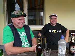 Alle trafen so langsam auf dem Grillplatz ein, wo, nun schon Tradition, das erste Bier aus den mitgebrachten Kästen getrunken wurde. Highlight weren: Brot, Schmalz, Gürkchen und verschiedene Kuchen, die von den Hausfrauen angeboten wurden |