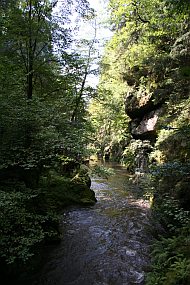 | Eine von bekanntesten Attraktionen der Böhmischen Schweiz sind die Klammen an dem Flüsschen Kamnitz. Die Entstehung dieser Gegend hat vor viele Millionen Jahre auf dem Meeresgrund begonnen. | |