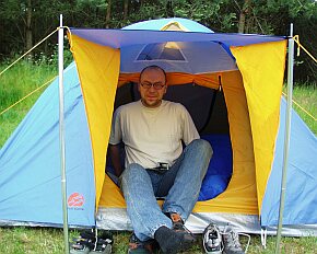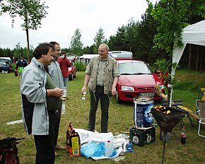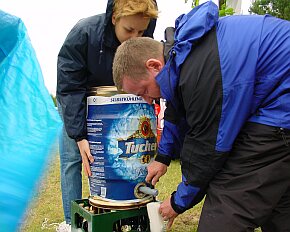 | Die erste Tätigkeit nach der Ankunft auf dem Zeltplatz ist die Errichtung des Pavillon. Danach wird der Kühlmechanismus des Bierfasses in Gang gesetzt. |
